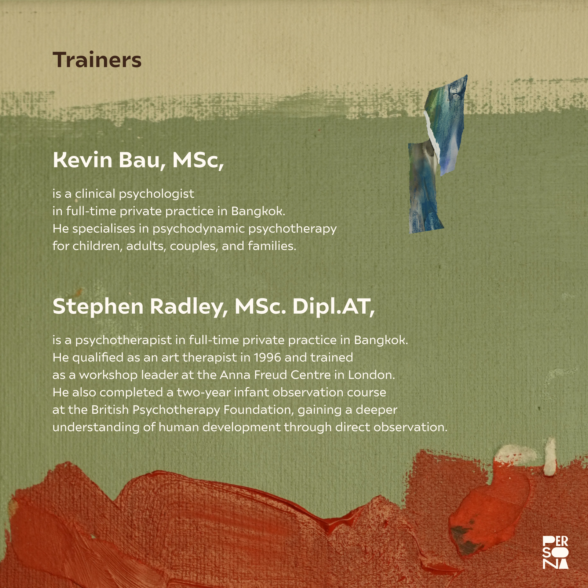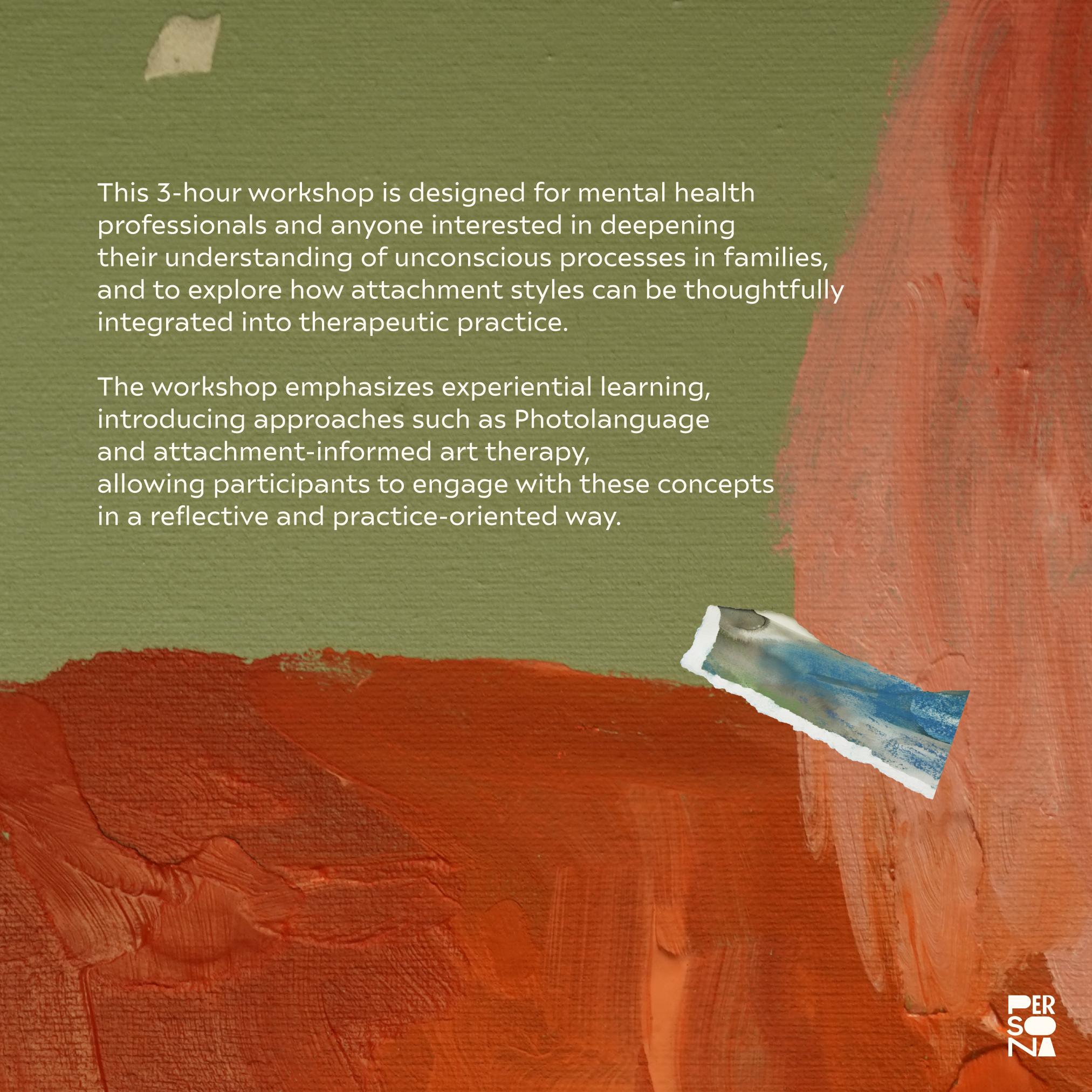 เวิร์กชอปนี้ออกแบบมาสำหรับผู้ประกอบวิชาชีพด้านสุขภาพจิตและทุกคนที่สนใจทำความเข้าใจเบื้องลึกว่าด้วยอิทธิพลและพลวัตจากครอบครัวที่อยู่ในจิตใต้สำนึกและสำรวจความเป็นไปได้ของการนำทฤษฎีความผูกพัน (Attachment Therory) ไปต่อยอดบูรณาการในการทำงานเชิงบำบัดของตัวเอง เน้นการเรียนรู้เชิงประสบการณ์ผ่านภาษาของภาพถ่ายและการรับรู้รูปแบบความผูกพันของตนเองผ่านศิลปะบำบัด จากแนวคิดสู่การลงมือทำและสะท้อนสิ่งที่ได้เรียนรู้ในรูปแบบของตัวเอง