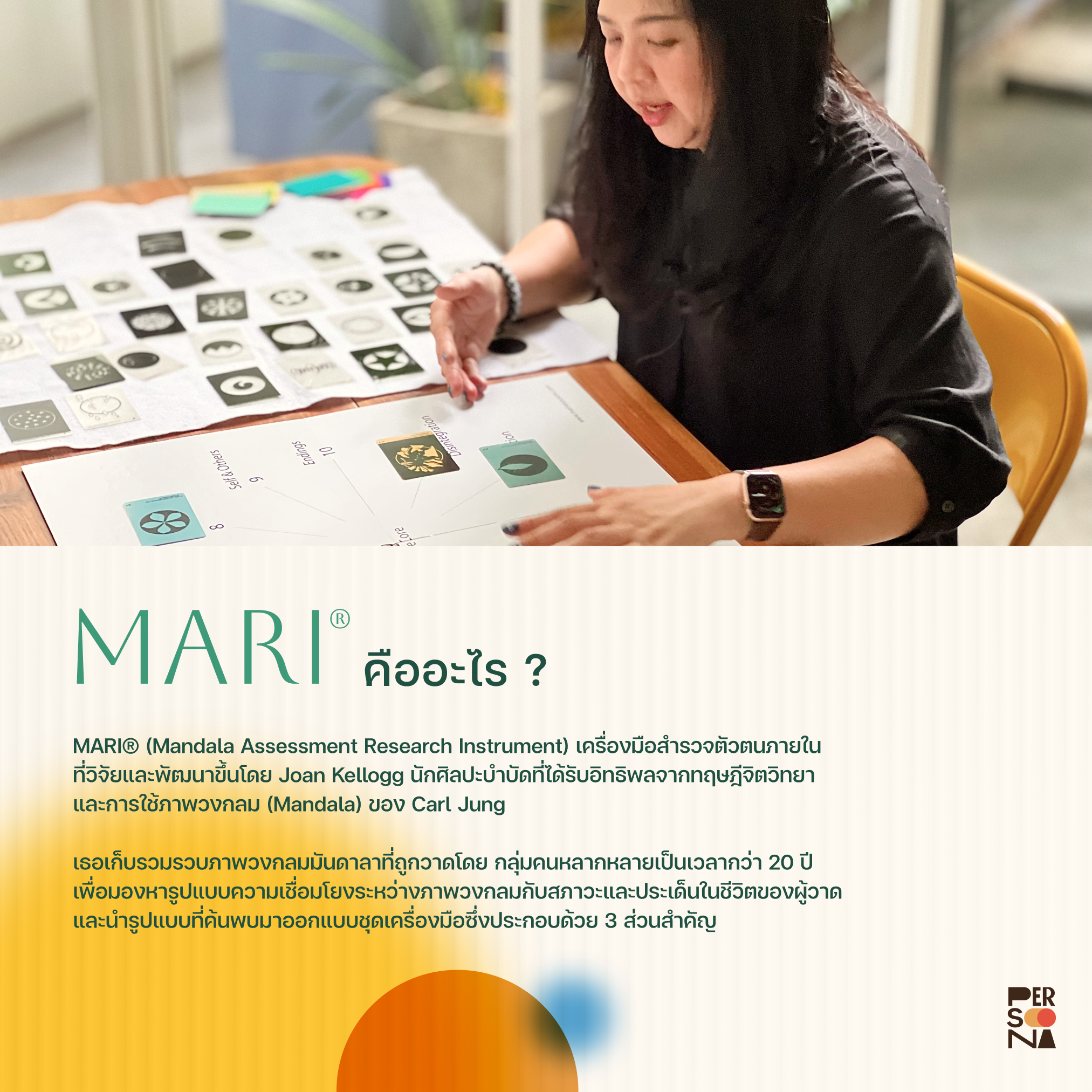 MARI® (Mandala Assessment Research Instrument) เครื่องมือสำรวจตัวตนภายในที่วิจัยและพัฒนาขึ้นโดย Joan Kellogg นักศิลปะบำบัดที่ได้รับอิทธิพลจากทฤษฎีจิตวิทยาและการใช้ภาพวงกลม (Mandala) ของ Carl Jung เธอเก็บรวมรวบภาพวงกลมมันดาลาที่ถูกวาดโดยกลุ่มคนหลากหลายเป็นเวลากว่า 20 ปี เพื่อมองหารูปแบบความเชื่อมโยงระหว่างภาพวงกลมกับสภาวะและประเด็นในชีวิตของผู้วาด และนำรูปแบบที่ค้นพบมาออกแบบชุดเครื่องมือซึ่งประกอบด้วย 3 ส่วนสำคัญ