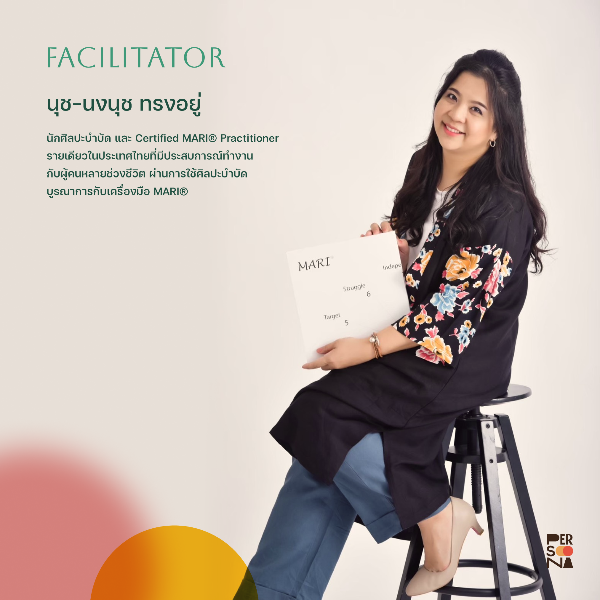 นุช–นงนุช ทรงอยู่ นักศิลปะบำบัด และ Certified MARI® Practitioner รายเดียวในประเทศไทยที่มีประสบการณ์ทำงานกับผู้คนหลายช่วงชีวิต ผ่านการใช้ศิลปะบำบัดบูรณาการกับเครื่องมือ MARI®