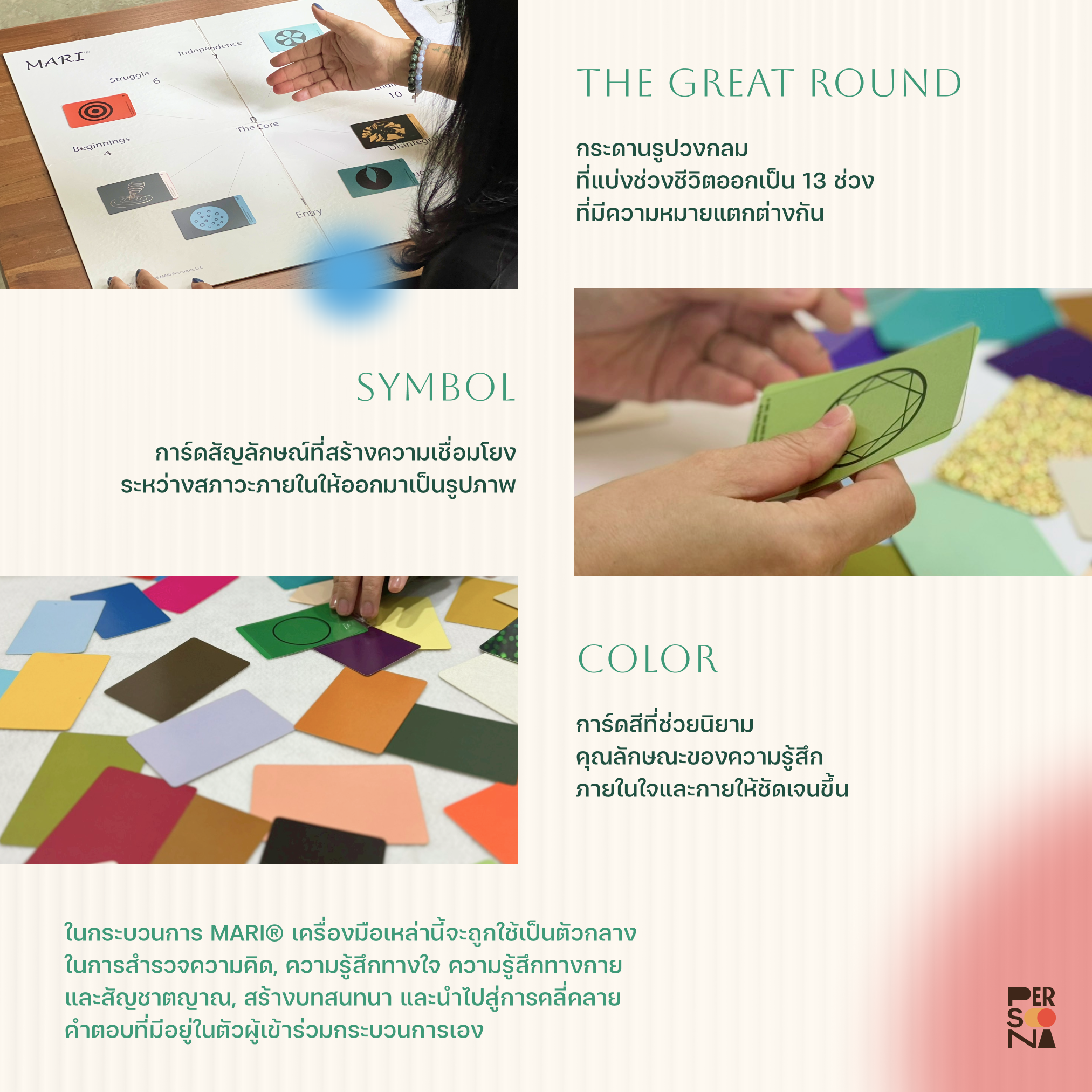 ในกระบวนการ MARI® เครื่องมือเหล่านี้จะถูกใช้เป็นตัวกลางในการสำรวจความคิด, ความรู้สึกทางใจ ความรู้สึกทางกาย และสัญชาตญาณ, สร้างบทสนทนา และนำไปสู่การคลี่คลายคำตอบที่มีอยู่ในตัวผู้เข้าร่วมกระบวนการเอง