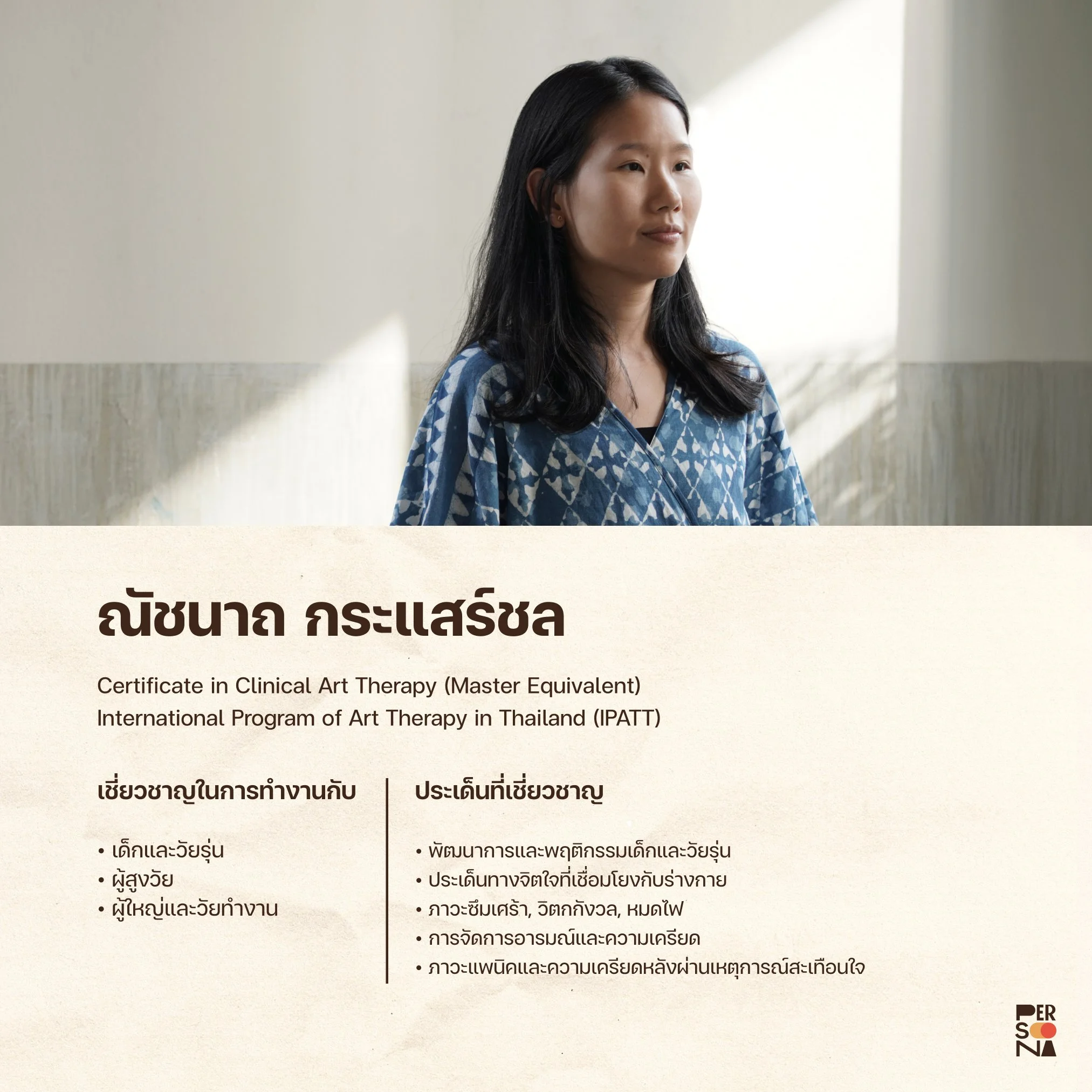 Studio Persona คือสตูดิโอที่หลอมรวมความหลากหลายของกระบวนการศิลปะบำบัด โดยนักศิลปะวิชาชีพที่มีความถนัดเฉพาะทางและมีประสบการณ์ทำงานทั้งในไทยและต่างประเทศ มีการประเมินผู้รับบริการ จัดการข้อมูลและความเป็นส่วนตัวอย่างเป็นระบบ ในพื้นที่สตูดิโอส่วนตัวย่านอโศก-พระราม 9 ที่ออกแบบสำหรับการทำศิลปะบำบัดโดยเฉพาะและสะดวกในการเดินทาง